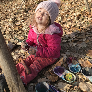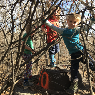 Being in a slightly different place, Parker spotted another entrance to the dragon's home not far from the path. A group of us went to explore and climb it. This challenged the Chickadees physically as it is raised up from the ground and in some dense shrubs. They had to think about how to get themselves up, did they need to ask for help or could they do it on their own? Those that were the first up helped others showing them handholds they could use and once on the top they respected each others space so everyone was comfortable. The Chickadees are definitely coming together as a group.