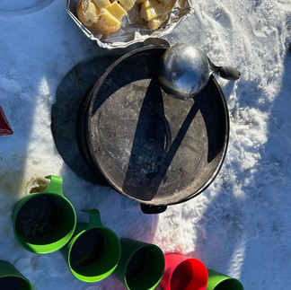 Soft, garlicky bread dough was floured, and wrapped around roasting sticks… While the soup simmered in the Dutch oven, the baguette was sliced along with fresh tomatoes and woeful onions. Dried herbs were sprinkled, cheese cut and melted, and balsamic glaze drizzled. Sublime smells filled the sun-dappled park; hot coals throbbed in the firepit. The teams worked swiftly and with stunning expertise, and before they knew it, the amuse-bouches were finished! Ah!
