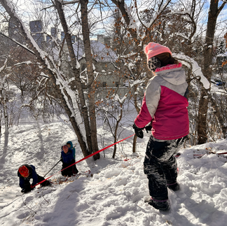 We spent a great deal of time piling snow in two spots to build Quinzhees. We had to share shovels, again work as a team, sometimes take direction from the group all while working hard digging and moving in the deep snow. Once we thought the snow piles were sufficient we let them sit to warm up in the sun and mold a bit so that we could dig them out in the afternoon. This lead us to free time. The Foxes had fun sledding, playing imagination games in pairs all the while Ted and Joe became safety and medic monitors to help with conflict and ensure everyone keeps their mitts on.