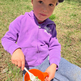 The squirrels have experienced a variety of spring weather this month, including some wet days, but the kids were all troopers and didn't let some rain slow them down. The plants on the bluff exploded and we enjoyed foraging for creeping bell and alfalfa, and enjoyed many tasty salads. Next the dandelions popped out and we could explore some different dandelion activities, making tea with the petals, painting with the bright yellow, weaving crows and creating dandelion bouquets.