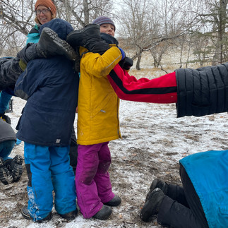 Heading out we entered a winter wonderland! Something I think we were all excited to venture forth in. Giant snowballs were made and snowflakes were caught on tongues as we headed to the bike park where we had a team/capture the flag snow ball fight. Lots of thought went into 'battle' strategies and prepping the home bases. The game got a little 'fiery' becoming a lovely opportunity to talk about the stages of a relationship.....what happens when we have conflict with others and how do we move past/though it to further build our ties?