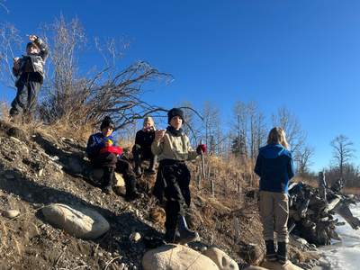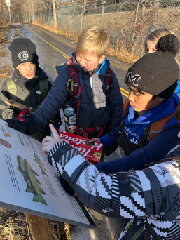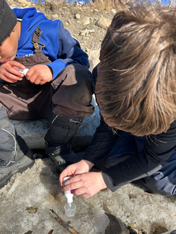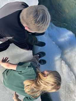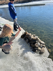 There is nothing like playing amongst ice all day and feeling the warmth of the sun on your face. The Owls learned about ice safety today and witnessed just how quickly massive ice slabs can break off into the river. The rule today was that we could not be on an overhang. We looked to see how we could tell if the ice was an overhang. We felt okay on ice that went straight down to the banks - it being at least a foot thick. We used ropes to slow explorers down and ensure only one was out at a time.
