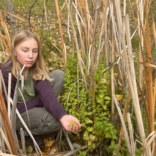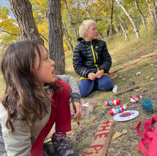 Before lunch we hiked down to the other side of the bike track to pick mint that is growing on the edge of the bluff. This sparked lots of excitement and appreciation for just how wonderful mint is! The Owls ate and harvested it to make mint tea with lunch. We talked about the Honourable Harvest and what we should be aware of when we forage/harvest. We wondered if this particular mint was invasive to the area, how it reproduced (by seed or root or both), how to harvest it without damaging the plant and if any animals on the bluff would be relying on the mint to get through the winter.