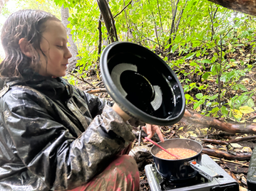 The rain is a great impetus to practice our knot and tarp skills! However, we were more concerned with speed today than design! Once we got our tarps up, we were able to play some games while keeping our gear dry. Ask your Owl to show you the slip knot, and what we did with it!