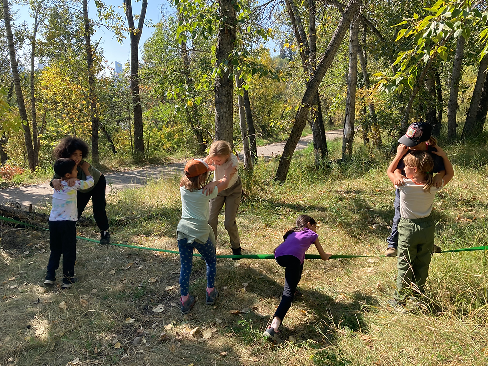We then walked over to our regular spot on the bluff and started working on making applesauce together. We peeled and chopped up the apples and then cooked them with a camp stove. While the apples were cooking, the rabbits enjoyed some free time. Free time activities included the mud kitchen, fort building, and playing on the slack line.