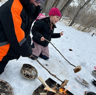 We started out our day with a game of coyote and mouse along the pathway. Once at our spot we had a little free time to explore the area, looking for new or old animal tracks and to break some of the coloured ice blocks that were there from last week. While the Squirrels explored we set up a fairy wand station. We had some lovely red willow branches that the Squirrels trimmed using gardening shears. Attention was made to being safe with the shears. After wrapping our wands we moved into snack time and a story. During snack time the temperature dropped and we started getting cold toes and noses so we set off to find some wood to make a fire. While gathering wood we found a fantastic snow slide going into the bike track and we spent a good amount of time climbing ropes and sliding down. We worked on sliding safety, communicating with each other when it was safe to slide and paying attention to our bodies and other people's space.