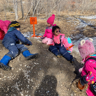 Today we got wet and muddy- and loved every bit of it! With the warm weather everything is melting, making the perfect opportunity for play. Digging in the rock pile, we discovered we could paint with mud! The squirrels scooped a container of whatever consistently of mud they liked best and experimented with what made the best paint. We had some long sheets of paper to paint on, but the cement barriers were the best canvas along with toothbrushes and paintbrushes as brushes. At the end of the day, the cement barriers are a work of art covered with names, shapes, trees and anything the kids dreamed up. We also played What time is it, Mr Wolf? and Rock, Paper, Scissors tag. The squirrels did a great job taking turns being the wolf and patiently waiting for their turn. In rock, paper, scissors tag everyone found it funny that both teams kept agreeing on the same action without knowing the other team had too! After enjoying a snack and story we continued working on our wood cookie nail art for the art gallery. We are working on nailing nails into the wood cookies to make designs or pictures and the squirrels are working hard to get it just how they want it. Some of the kids finished nailing and were ready to start wrapping yarn around the nails. We used many different colors and strategies to get it just right, and we will continue to work on it in the coming weeks. One of the highlights of today was doing a rope climb up a steep and muddy hill. Persistence and teamwork was key to making it up the hill without slipping down. Using a rope to climb up helped, and soon we discovered slipping down was just as fun as going up! Mudslides are always fun and require the challenge of coming back up. Have a great week, see you soon Squirrels!